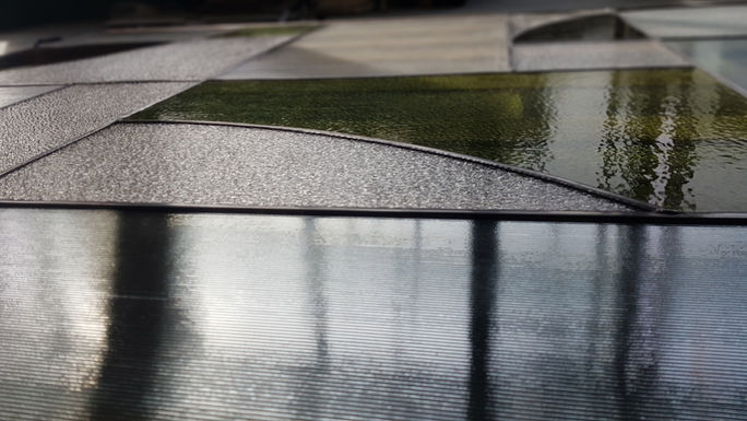Jeux de textures et de lumière pour ce grand vitrail rétro-éclairé de 280x180cm.